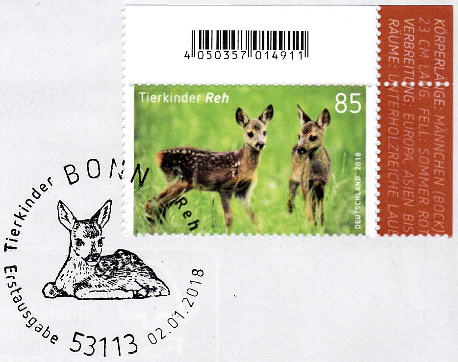 Bei der Deutschen Post erschien am 2.1.2018 in der Serie "Tierbabys" diese Marke mit zwei jungen Rehen (MiNr 3352).