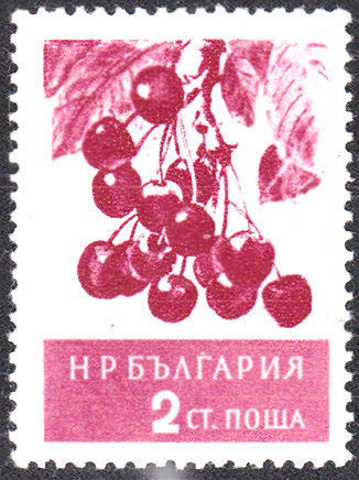 Diese Marke aus Bulgarien (MiNr 990) zeigt Süßkirschen (Prunus avlum) im Markenbild.