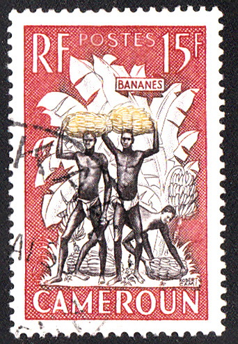 Auf diesen beiden Marken aus Kamerun sehen wir Helfer bei der Bananenernte.