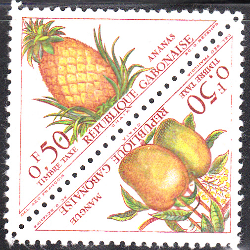 Auf der Portomarke aus Gabun links oben (MiNr 34) zeigt eine Ananas. Die beiden zuletzt gezeigten Portomarken wurden jeweils zusammengedruckt verausgabt.