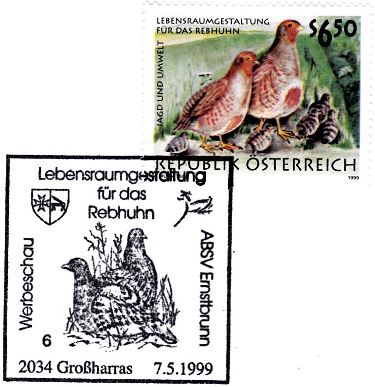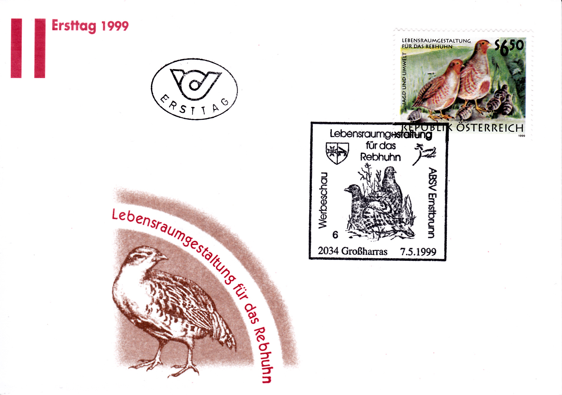 FDC mit der bereits gezeigten Marke aus Österreich (MiNr 2281) zum Thema "Lebensraumgestaltung für das Rebhuhn" und einem zum Markenmotiv passenden Sonderstempel aus Großharras.