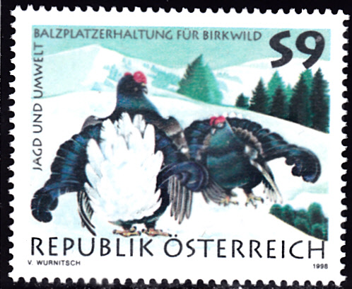 In der Serie "Jagd und Umwelt" erschien in Österreich auch diese Marke (MiNr 2244) zum Thema "Balzplatzerhaltung für das Birkwild" mit zwei Balzenden Birkhühner (Tetrao tetrix).