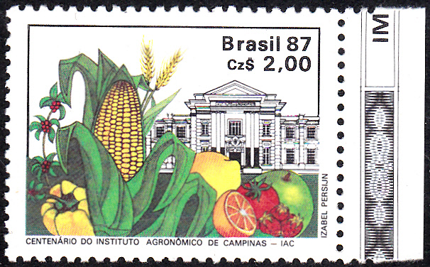 Diese Marke aus Brasilien (MiNr 2218) zum Jubiläum "100 Jahre Landwirtschaftliches Institut von Campinas, São Paulo" zeigt rechts unten auch einig Obstsorten. (Orange, Zitrone, Apfel, Erdbeere).