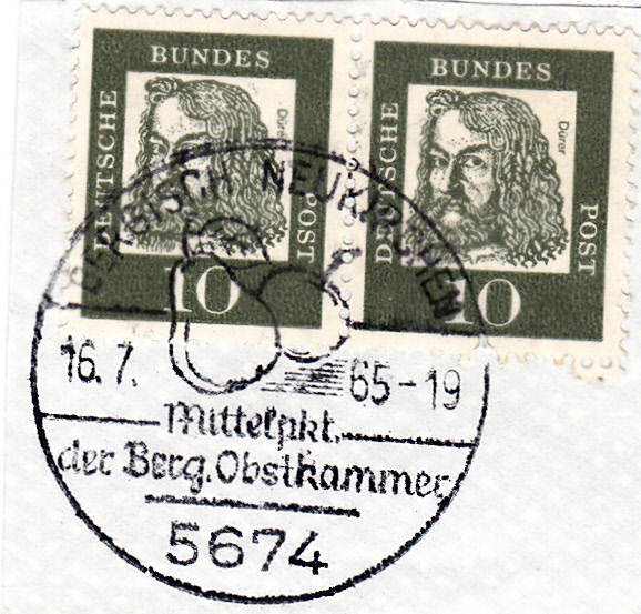 Handwerbestempel aus Bergisch Neukirchen vom 16.7.1965 mit der Aussage "Mittlelpkt. der Berg. Obstkammer" und einem Apfel und einer Birne im Stempelbild.