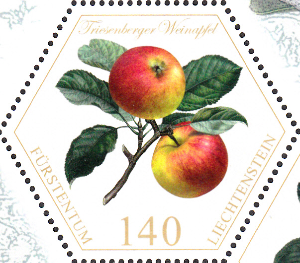 In Liechtenstein erschienen 2015 acht Marken mit acht alten Apfelsorten. Hier zunächst die Marke mit einer Abbildung der Sorte "Triesenberger Weinapfel" (MiNr 1765).