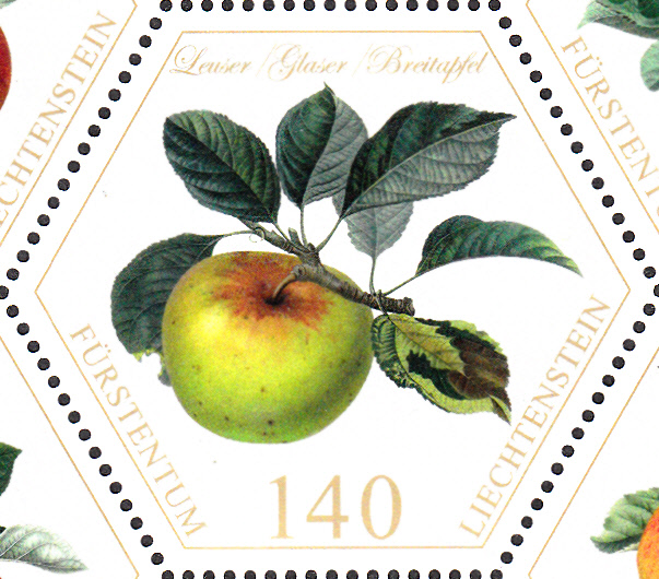 Die nächste Marke der Serie (MiNr 1767) zeigt die Sorte "Leuser", die auch "Glaser" oder "Breitapfel" genannt wird.