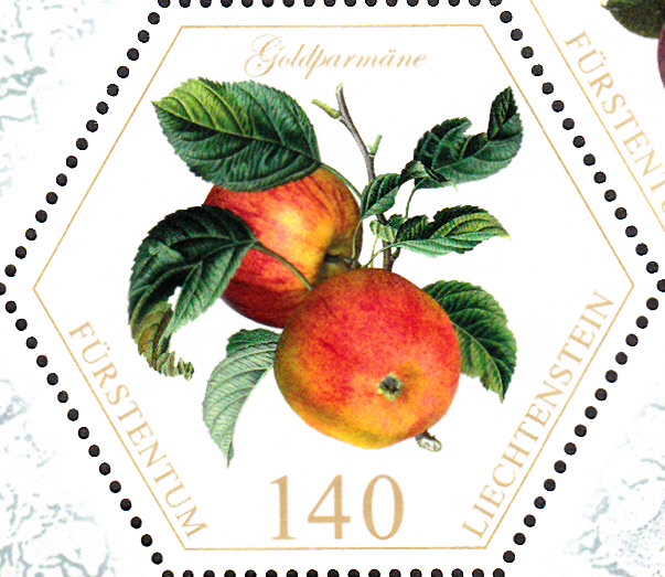 Hier eine Marke (MiNr 1771), die eine Apfel der Sorte "Goldparmäne" abbildet.