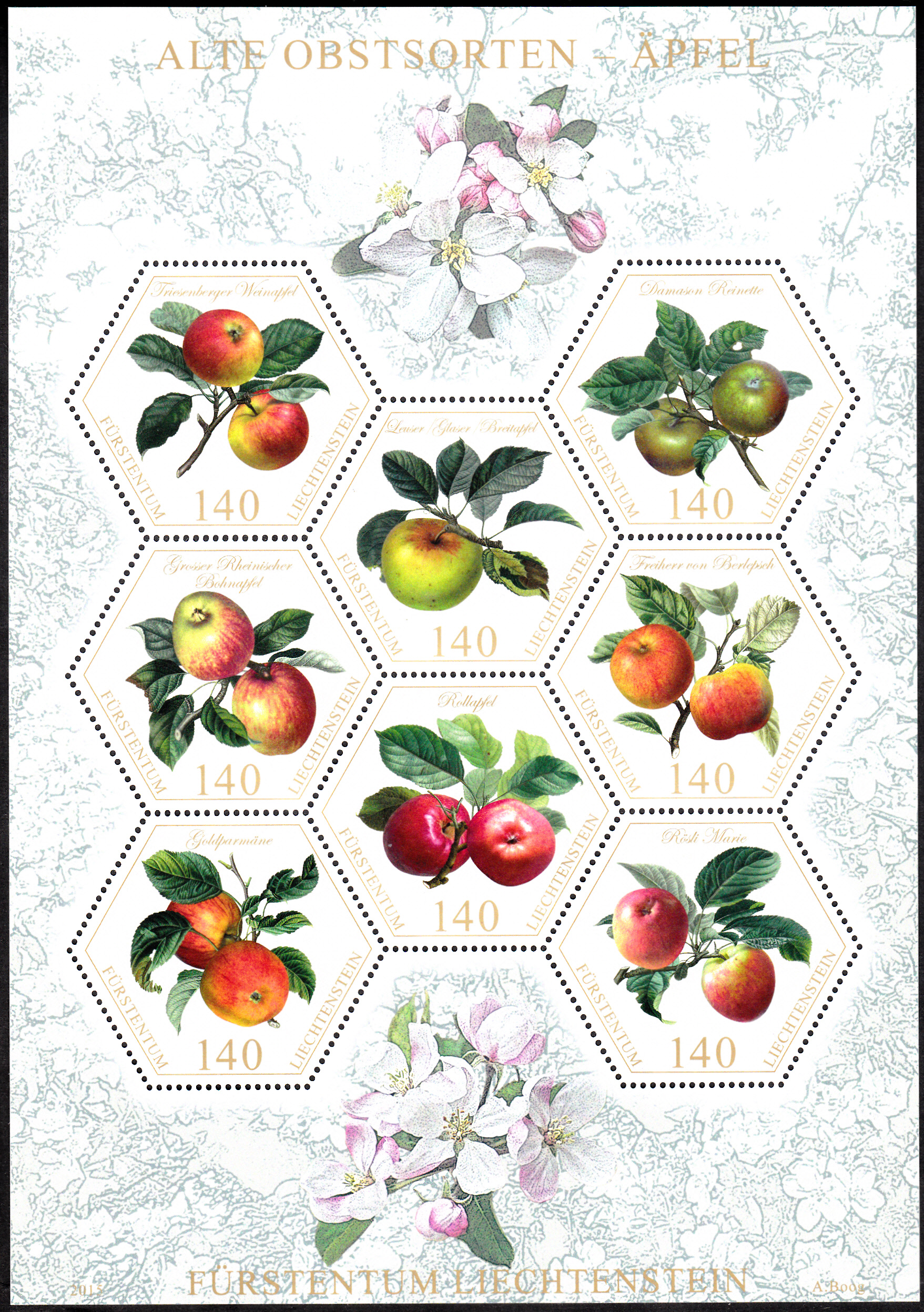 Diese acht Marken mit den Apfelsorten wurde als selbstklebende Marke in einem Bogen zusammen gedruckt. Hier ein ganzer Bogen: