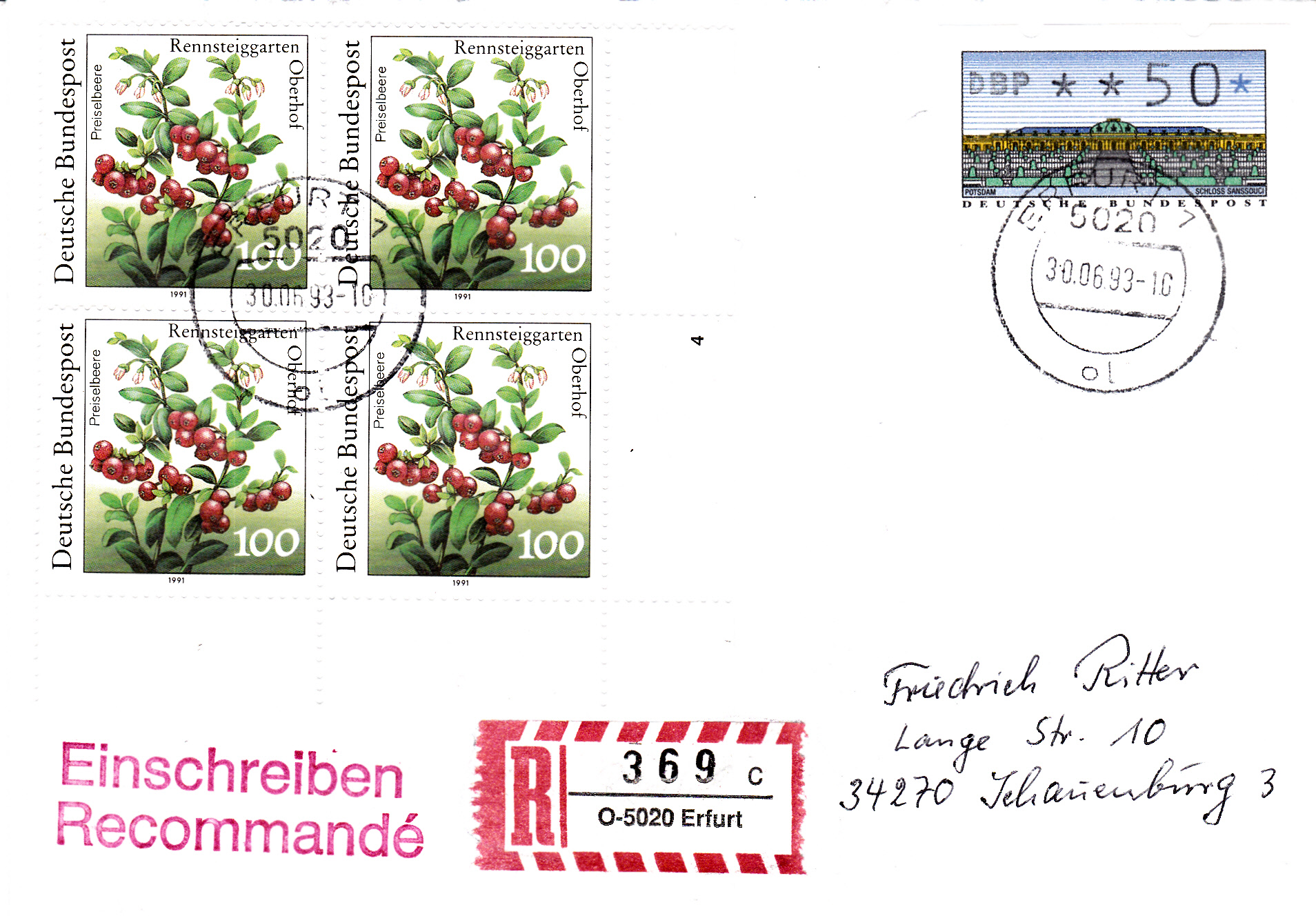 Auf diesem Brief per Einschreiben wurde auch ein Eckrandviererblock mit der Formnummer "4" dieser Marke zur Frankatur verklebt.
