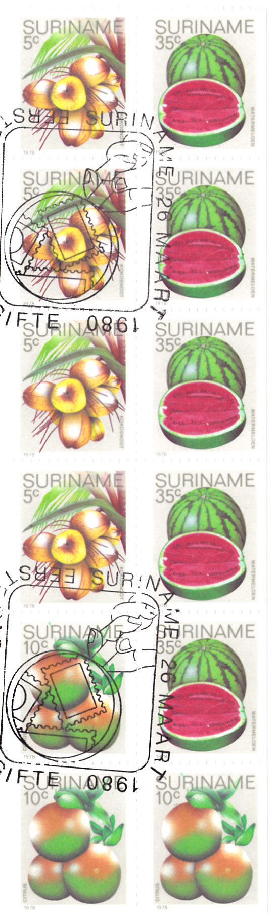 In einer Serie "Früchte" ist diese Marke (MiNr 838 A) in Surinam erschienen. Sie zeigt Kokosnüsse an einer Kokospalme.