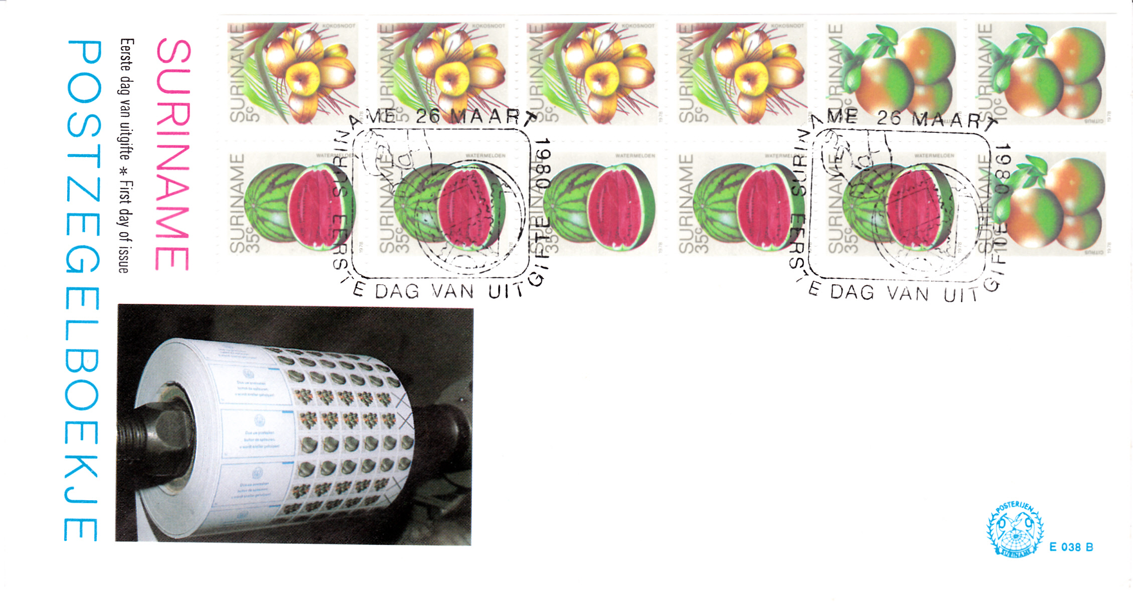 Die auf dem FDC gezeigten Marken aus Surinam gibt es auch bis auf die Marke mit den Bananen teilgezähnt aus Markenheftchen.