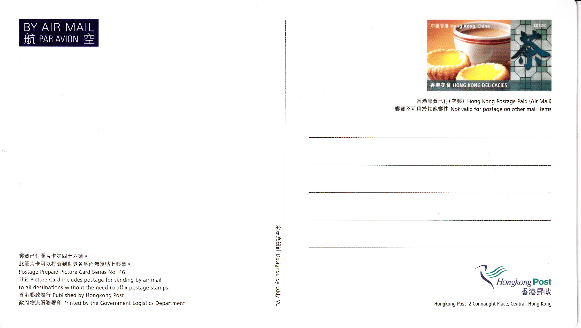 In Hongkong wird in zahlreichen Restaurants eine große Auswahl an Gerichten mit frischen Fischen, Garnelen, Krabben, Muscheln, Austern und Meeresfrüchten angeboten. Auf dieser Ganzsache aus Hongkong sehen wir sowohl im "Wertstempel" als auch auf der Bildseite eine Platte mit Meeresfrüchten. Die Abbildungen sind bildgleich mit der Marke Hongkong MiNr 1736.