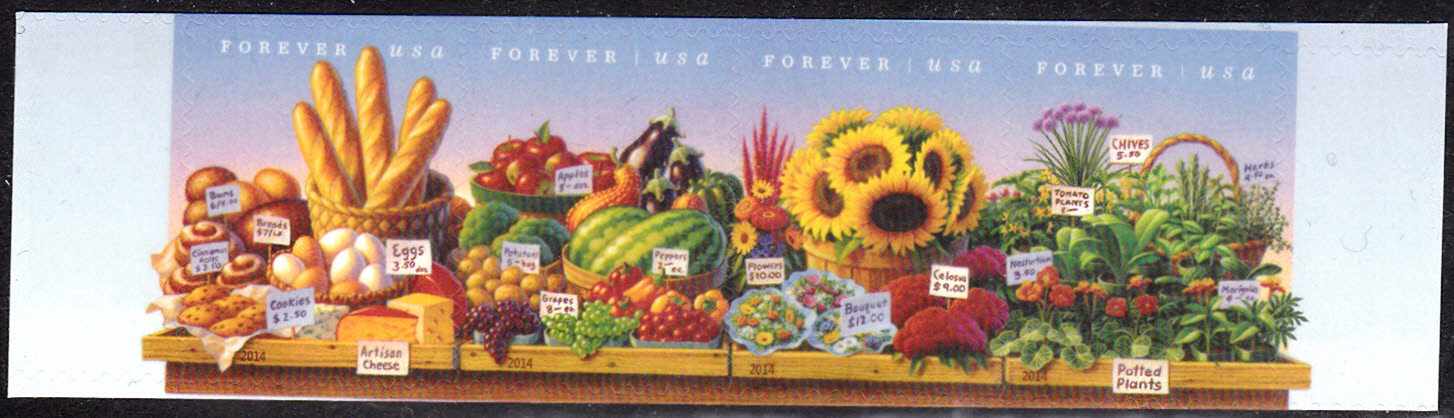 Am 7.8.2014 erschien in den USA ein Streifen mit vier Marken zum Thema Bauernmärkte. Auf der ersten Marke von links sehen wir Backwaren wie z.B. Brot, Eier und Käse. Die zweite Marke von links zeigt uns Obst und Gemüse. Die beiden anderen Marken sind zum Thema Essen und Trinken nicht passend, sie zeigen Schnittblumen und Topfpflanzen.