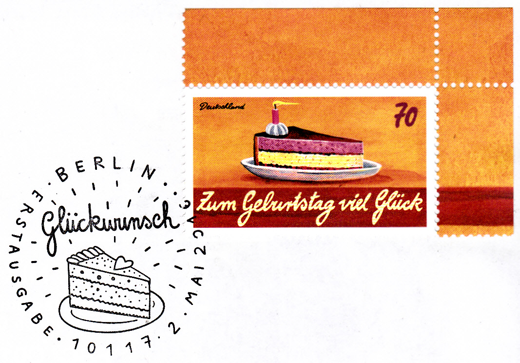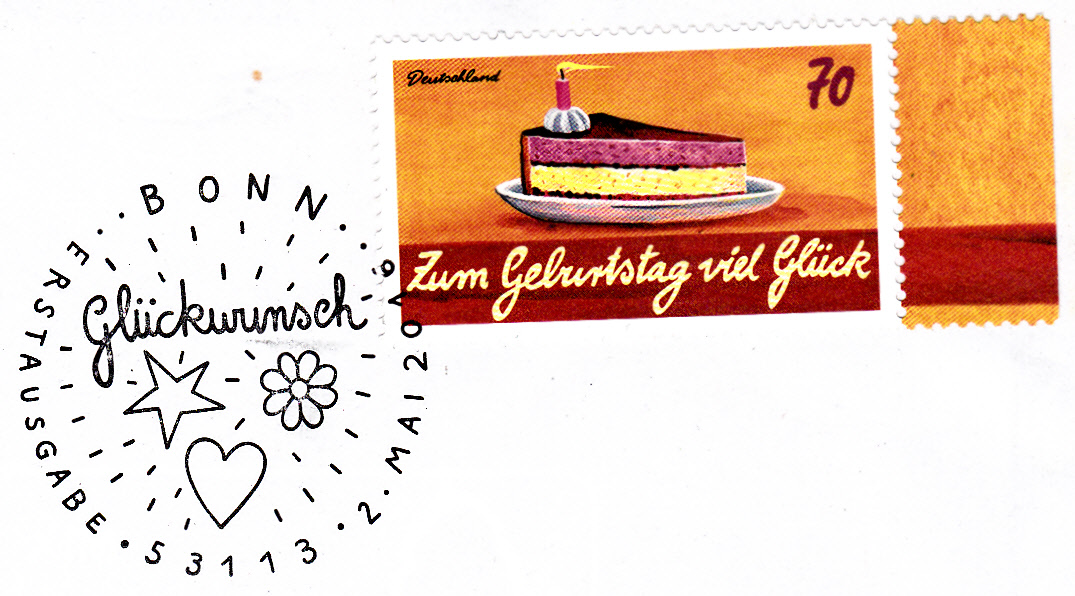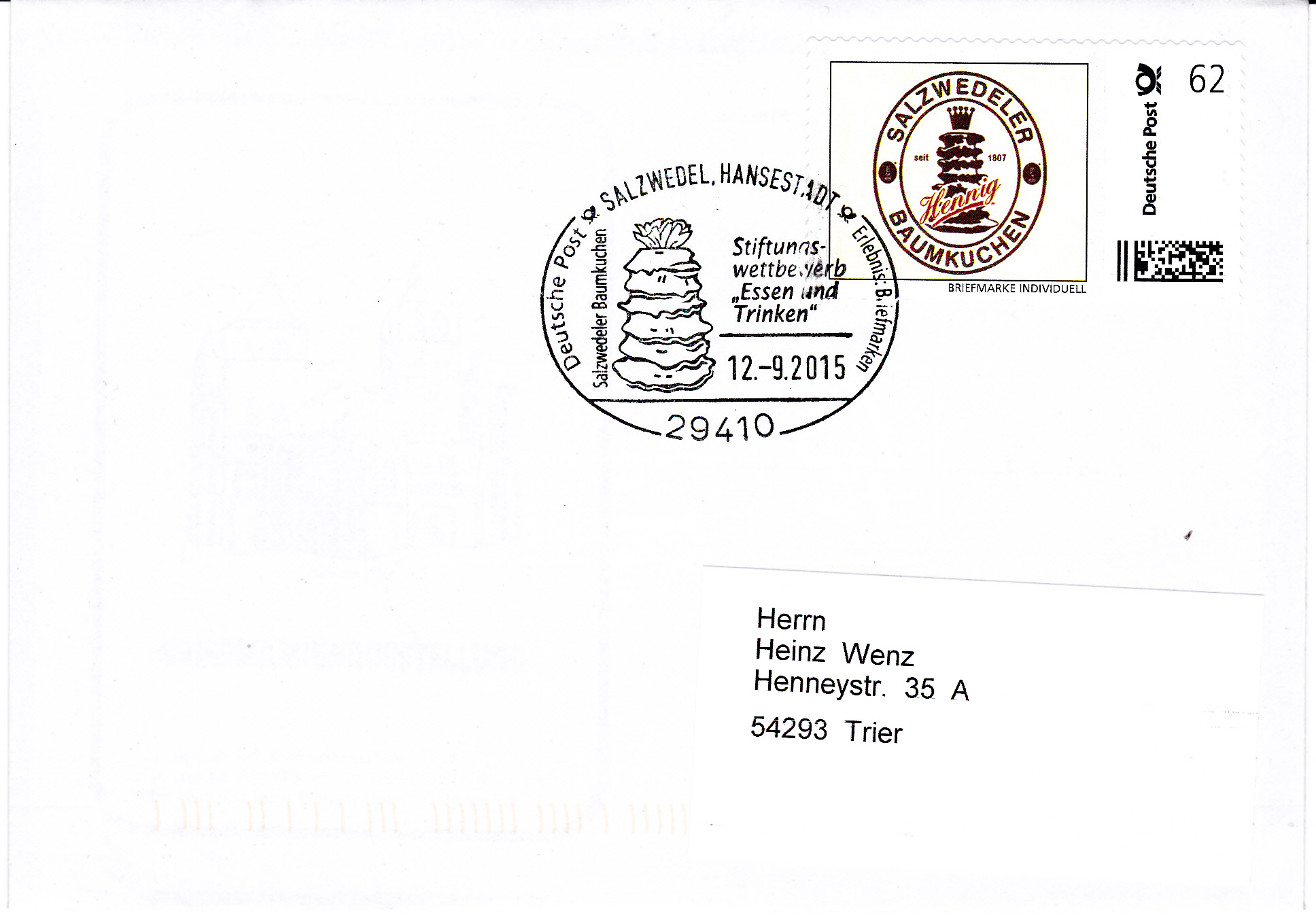 Auf dieser Briefmarke Individuell sehen wir ein Logo der Firma "Hennig", der ersten Baumkuchenfabrik in Salzwedel, mit der Abbildung eines Baumkuchens. Die Marke gibt es auch mit anderen Wertstufen für Standardbriefe der vorangegangenen Portozeiträume.