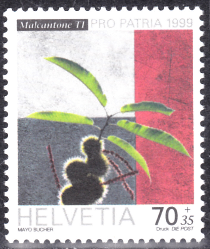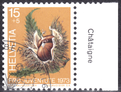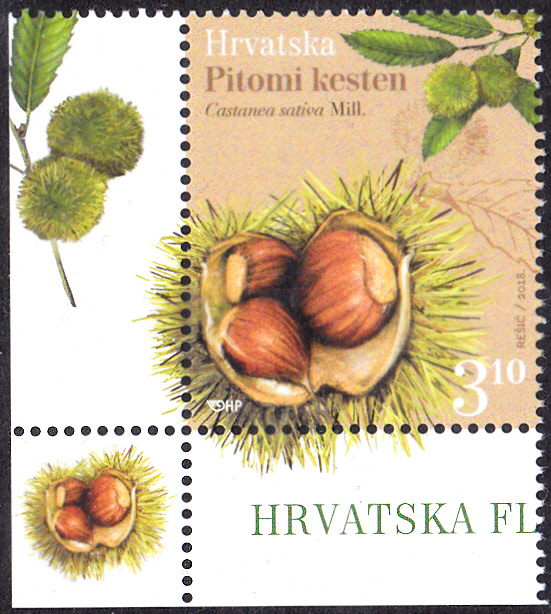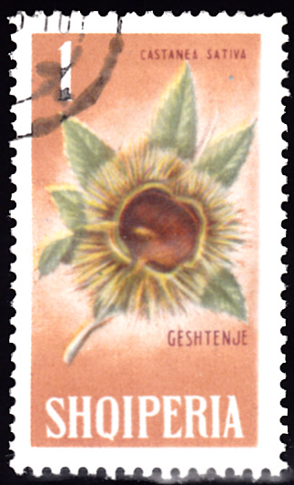 Auf dieser Marke aus Spanien (MiNr 2149) sehen wir Esskastanien an einem Zweig.