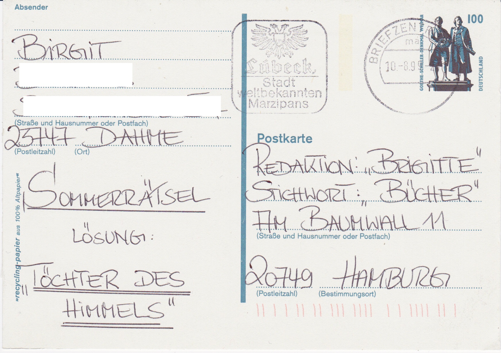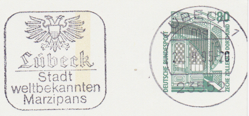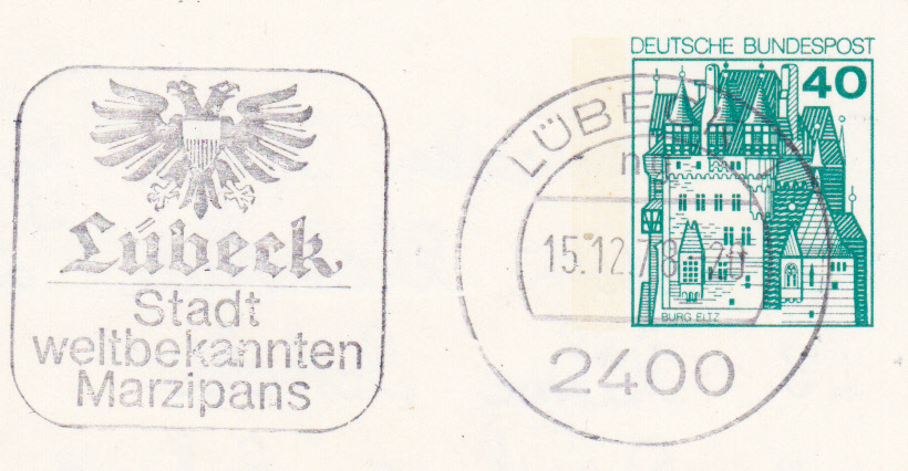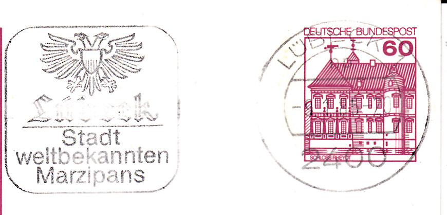 Maschinenwerbestempel aus Lübeck vom 10.2.1990 mit Kennbuchstaben "ns" und Werbeeinsatz "Lübeck Stadt weltbekannten Marzipans".