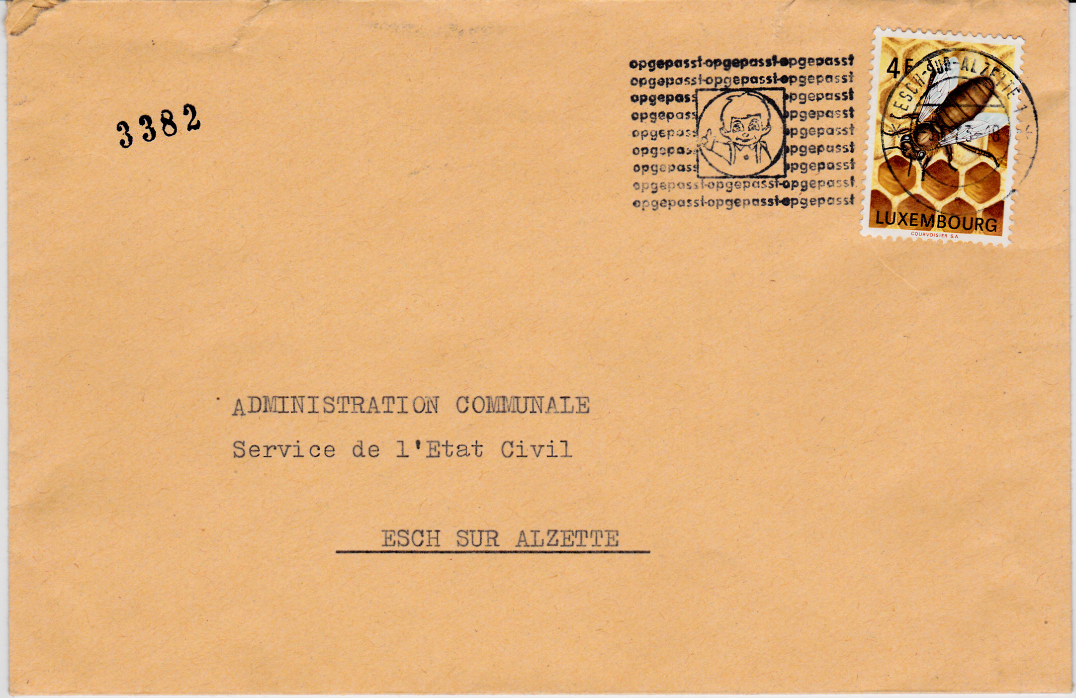 Diese Marke aus Luxemburg (MiNr 864) zeigt eine Biene auf einer Honigwabe.