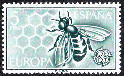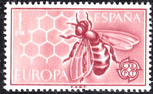 Die Europamarken 1962 aus Spanien zeigen als Motiv eine Honigbiene (Apis mellifera) auf Waben.