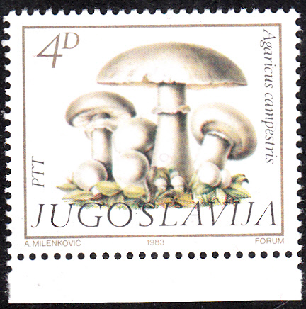 Auf dieser Marke aus Jugoslawien (MiNr 1977) ist ein Wiesen-Champignon abgebildet.