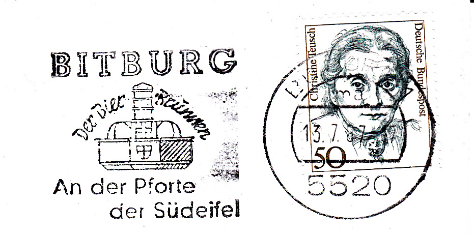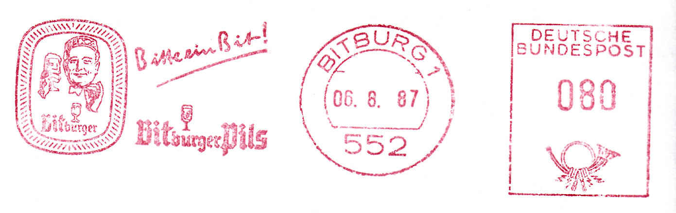 Ergänzend zu einem vorhergehenden Beitrag zeige ich hier noch den Maschinenwerbestempel mit dem Bierbrunnen mit dreistelliger Postleitzahl 552 Bitburg und mit dicken ausgefüllten Buchstaben im Werbeeinsatz beim Text "Bitburg".