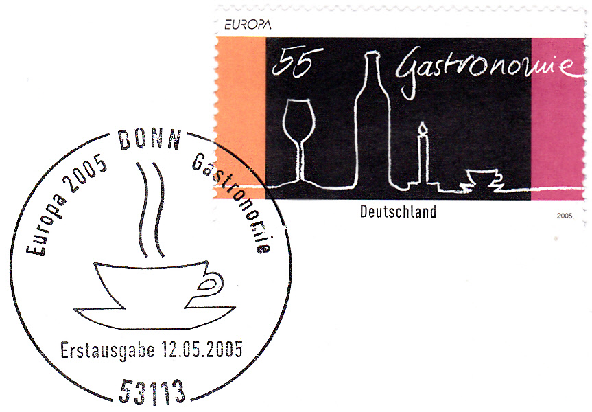 Im Ersttagsonderstempel aus Bonn vom 12.5.2005 zur Europamarke 2005 wird eine Kaffeetasse gezeigt. Auch im Markenbild ist auf dem gedeckten Tisch eine Rasse zu sehen.