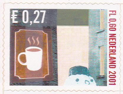 Diese niederländische Marke (MiNr 1952) zeigt eine Kaffeetasse auf einem Schild.