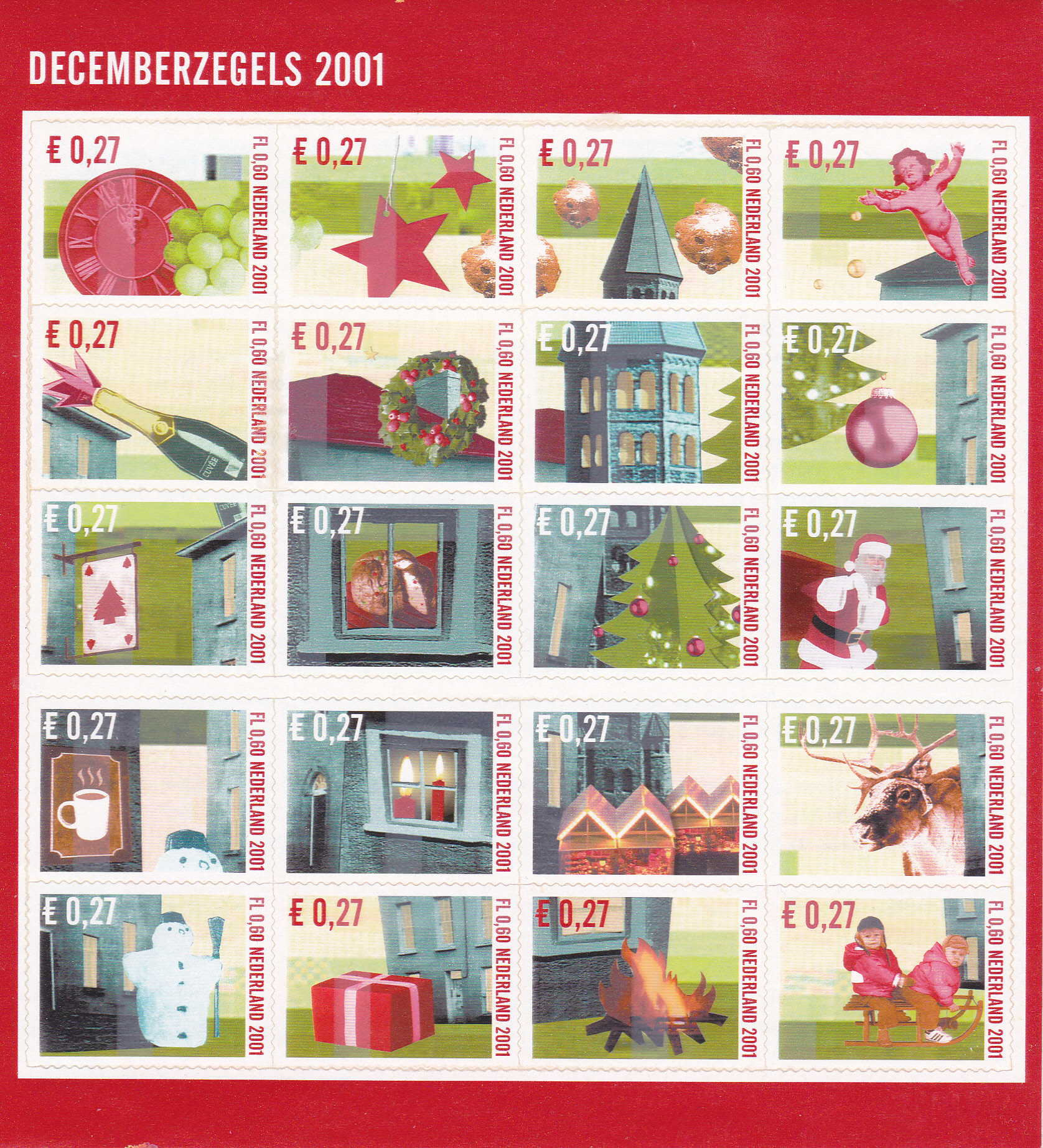 Die gezeigte Marke ist in Rollen erschienen und wurde auch zusammen mit 19 weiteren Marken als Folienbogen verkauft. Hier ein kompletter Bogen dieser Dezembermarken: