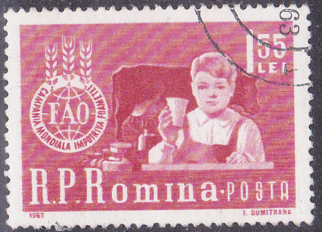 Diese Marke aus Rumänien (MiNr 2128) zum Thema "Kampf gegen den Hunger" zeigt ein milchtrinkendes Kind vor einer Kuh mit Melkmaschine.
