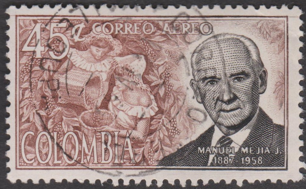 Kolumbien MiNr. 1058 zeigt Manuel Mejia, den Gründer der nationalen Vereinigung der Kaffeepflanzer sowie die Kaffee-Ernte: