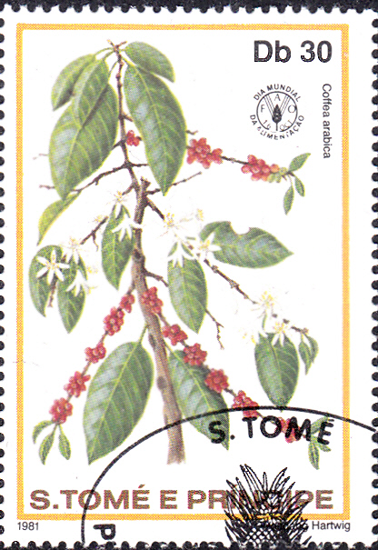 Diese Marke aus Sao Tomé und Principe (MiNr 749 A) zeigt einen Zweig Arabica-Kaffee (Coffea arabica) mit Blüten und Kaffeekirschen.