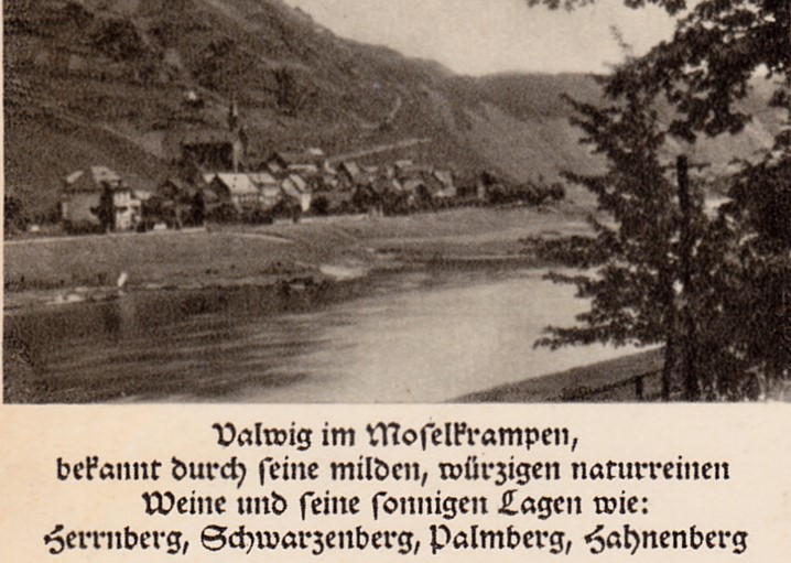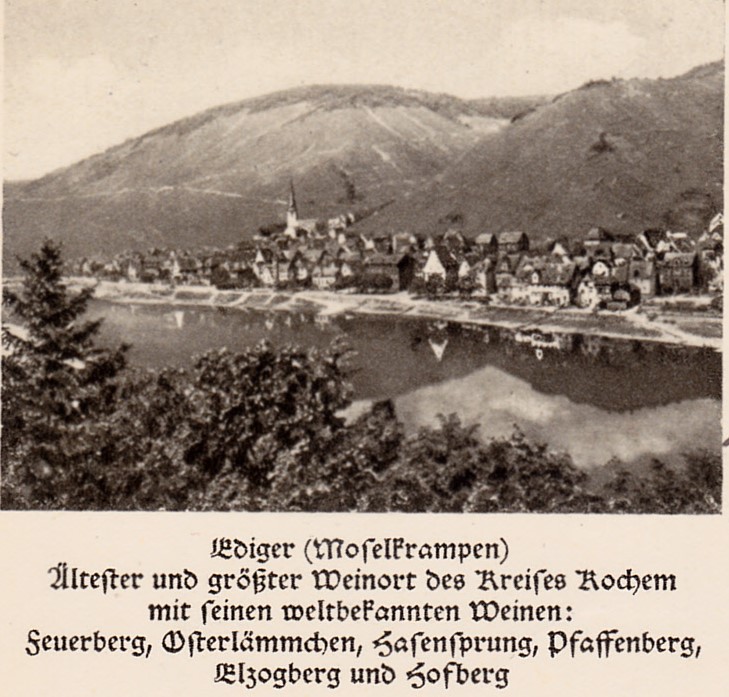 Der Weinort Ediger (seit 7. Juni 1969 Ediger-Eller) wirbt auf dieser Bildpostkarte 1937 (MiNr P 236; Serie 94 Bild 1) für seine bekannten Weine und nennt auch einige der Weinlagen.