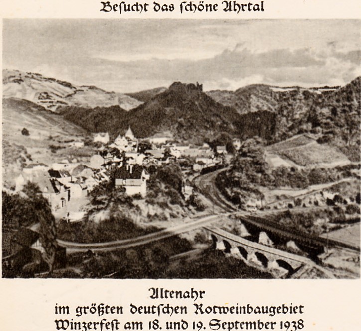 Altenahr wirbt auf dieser Karte (MiNr P 236, Serie 108 Bild 6) wieder mit dem gleichen Foto wie im Vorjahr für sein Winzerfest am 19. und 20. September 1939 und das Erntedankfest am 1. Oktober 1939.
