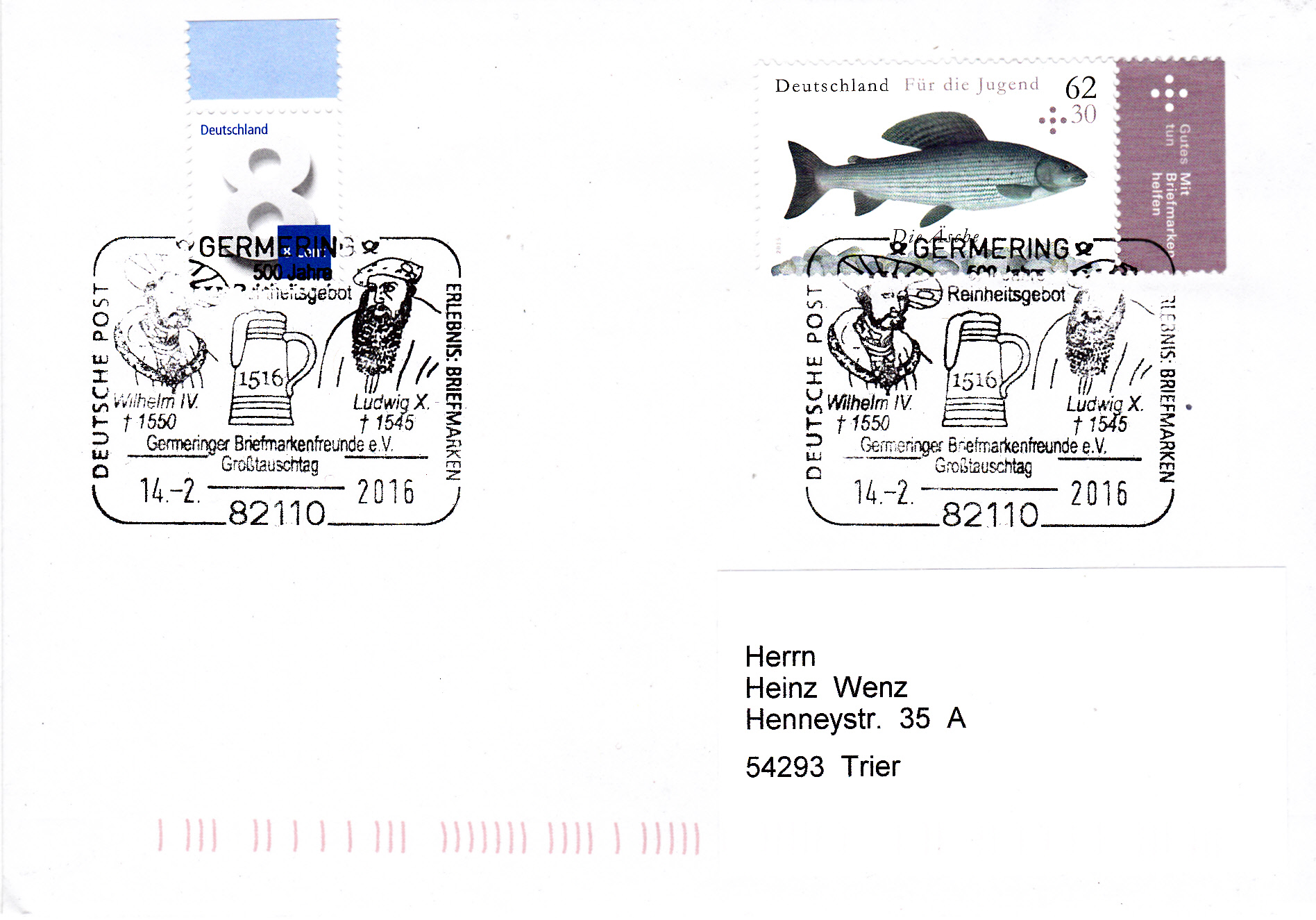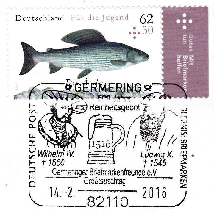 Sonderstempel aus Germering vom 14.2.2016 zum Jubiläum "500 Jahre Reinheitsgebot" mit der Abbildung eines Bierkruges mit der Zahl 1516 und den beiden Herzögen Wilhelm IV. und Ludwig X.