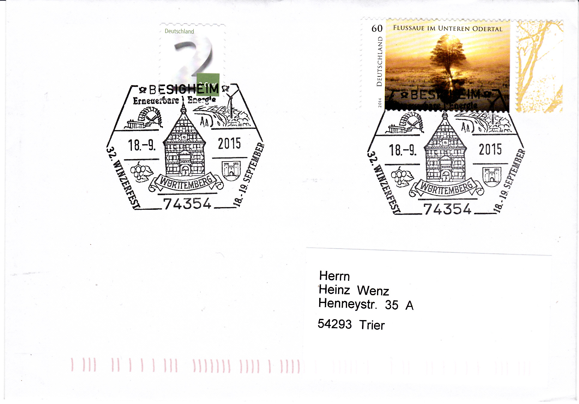 Sonderstempel aus Besigheim von 18.9.2015 zum 32.Winzerfest am 18./19.September 2015. Im Stempelbild sind links unten auch Weintrauben und Rebenblätter zu sehen.