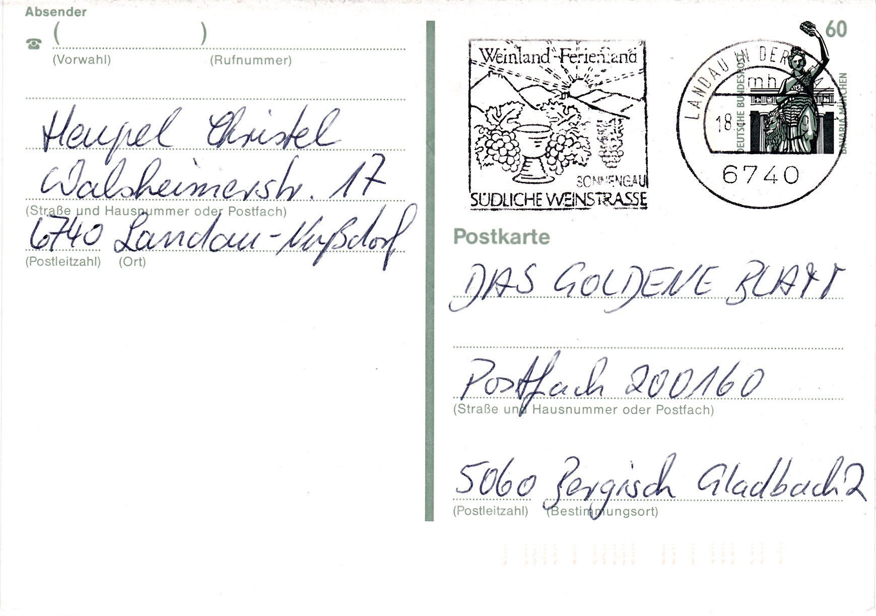 Maschinenwerbestempel aus Landau in der Pfalz mit dem Werbeeinsatz "Weinland - Ferienland Südliche Weinstrasse" und Weintrauben und Weinrömer im Bild.