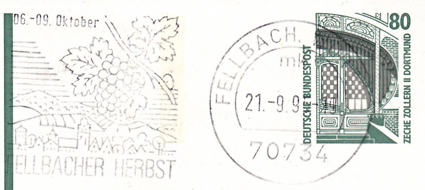 Maschinenwerbestempel vom aus Fellbach zum Fellbacher Herbst mit einer Weinrebe.