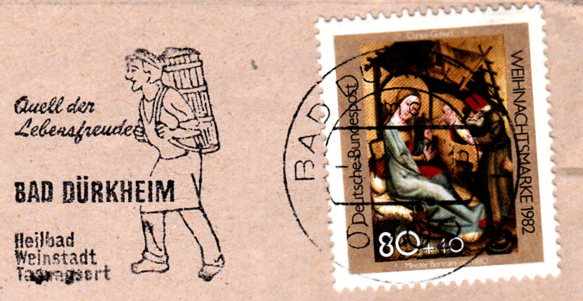 Maschinenwerbestempel aus Bad Dürkheim mit der Abbildung eines Winzers mit Tragebütt bei der Weinlese.