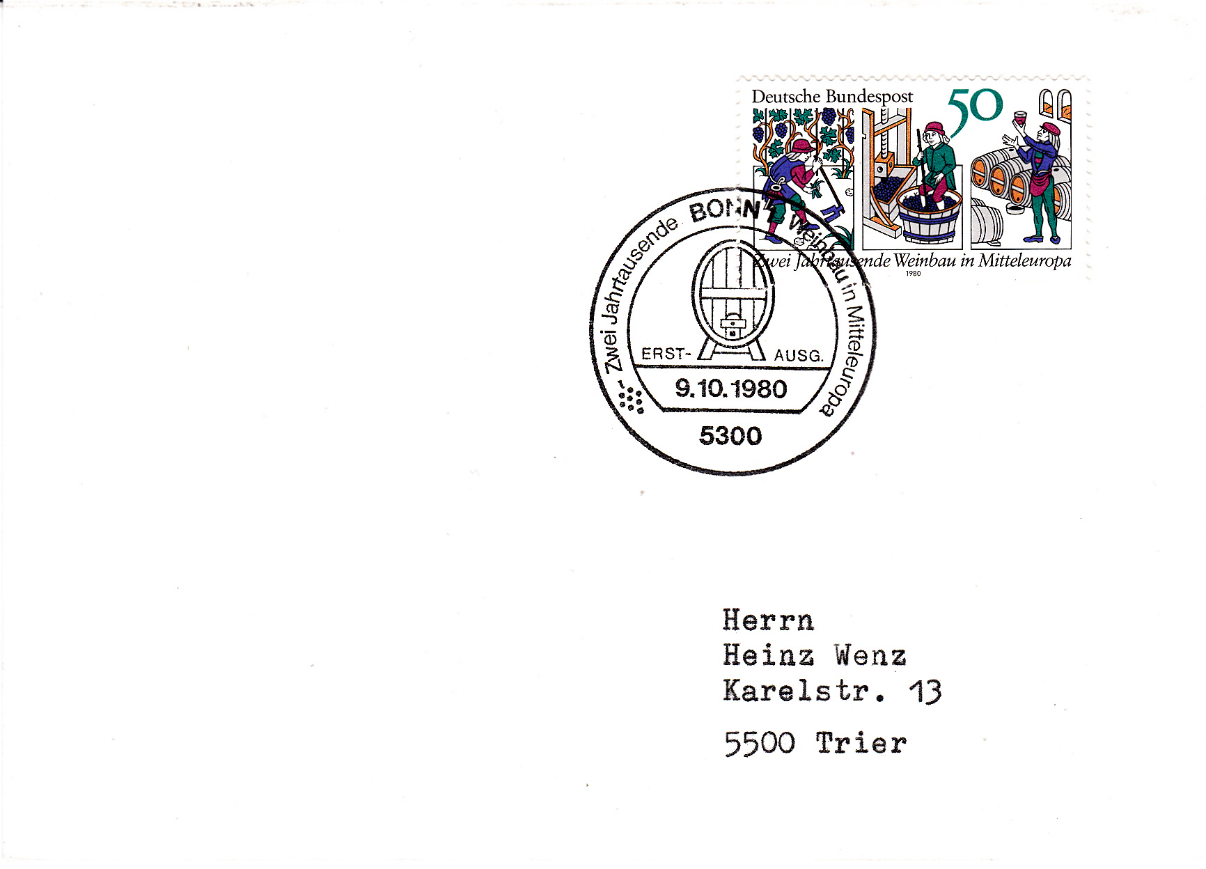 Ersttagsbrief mit der Marke "Zwei Jahrtausende Weinbau in Mitteleuropa" der Deutschen Bundespost mit Ersttagsonderstempel Bonn. Im Markenbild sind der Anbau, die Ernte und die Veredelung des Weines nach einem Holzschnitt aus dem Lehrbuch "Rucelia commoda" (1309) von Petrus de Crescentiis (um 1230 bis 1310?, italien. Schriftsteller) dargestellt. Im Ersttagstempel wird ein Weinfass gezeigt.