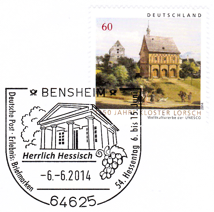 Im Sonderstempel zum 54. Hessentag 2014 in Bensheim werden unten rechts auch Weintrauben gezeigt.