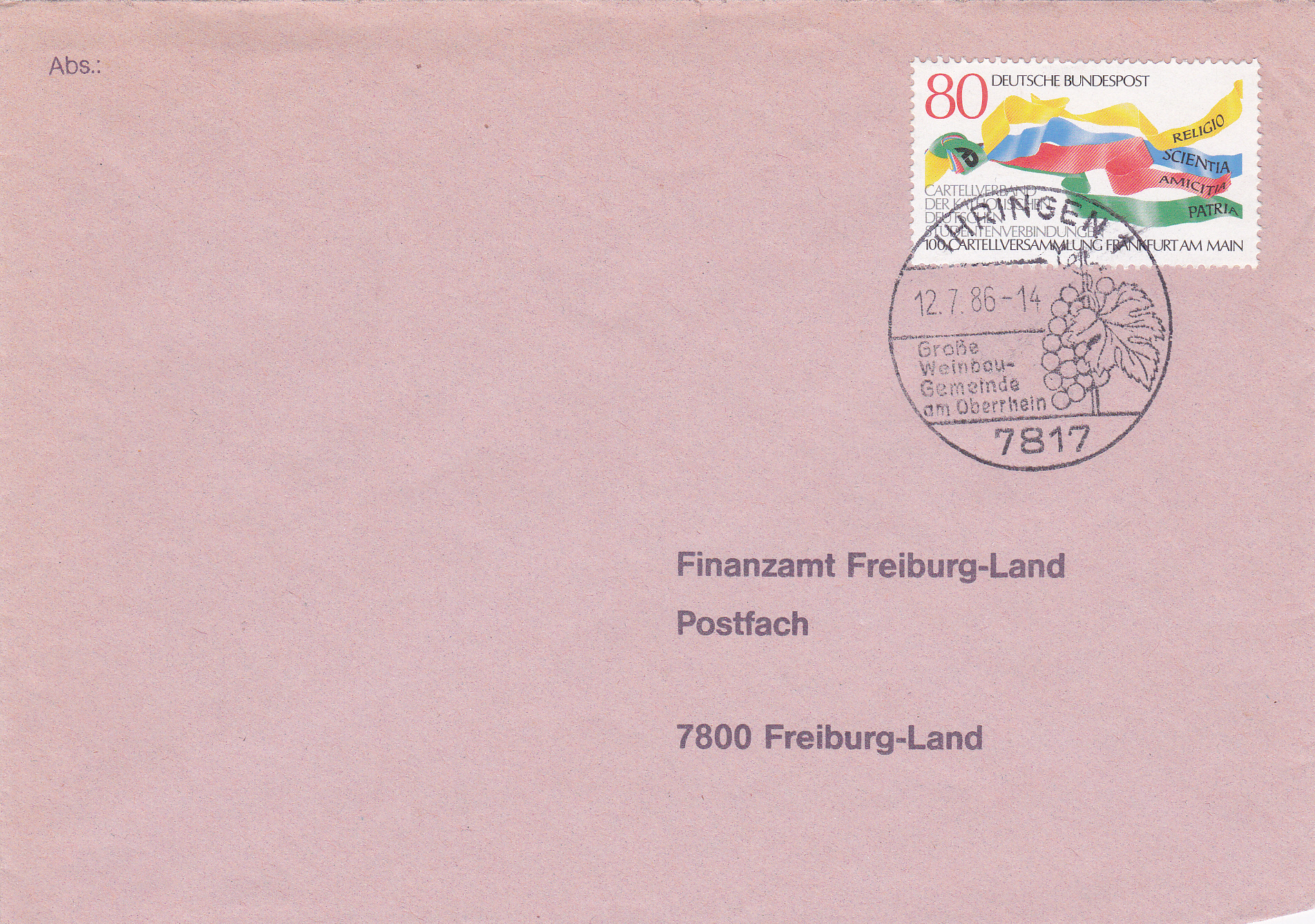 Dieser Handwerbestempel vom 12.7.1986 zeigt im Stempelbild Weintrauben und weusr im Texr auf den Weinbau in Ihringen hin.