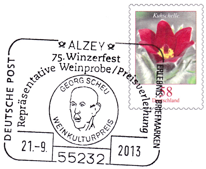 Plusbrief (MiNr U 42) mit dem Wertstempel "Kuhschelle" (MiNr 2968) und mit einem Zudruck "75. Alzeyer Winzerfest" und dem dazu passenden Sonderstempel vom 20.-9.2013 aus Alzey zum 75. Winzerfest.