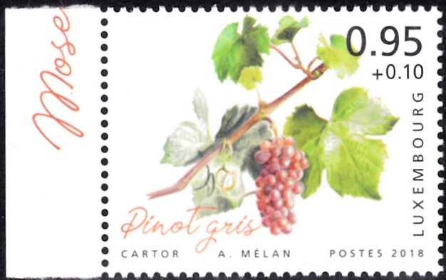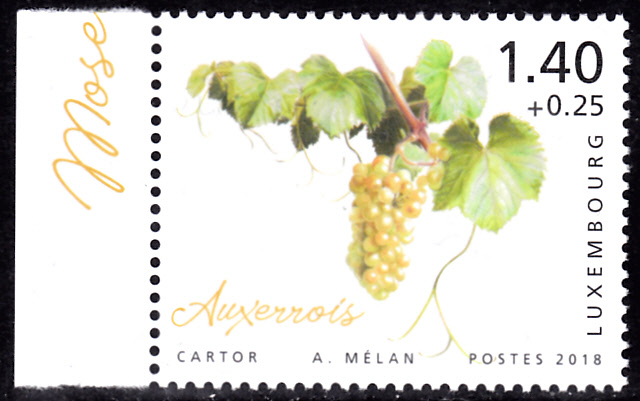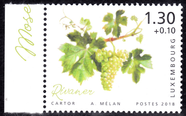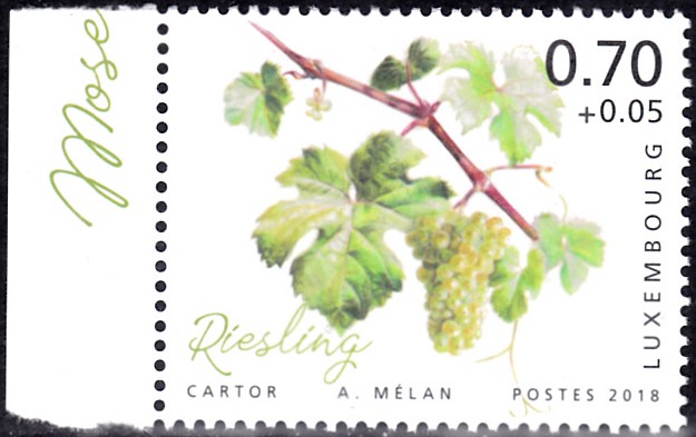 In Luxemburg isind 2018 in einer Serie "Luxemburger Moselregion" Marken mit Abbildungen zu verschiedenen Rebsorten erschienen. Hier zeige ich eine Marke (MiNr 2184) mit einer Abbildung der Rebsorte "Riesling".