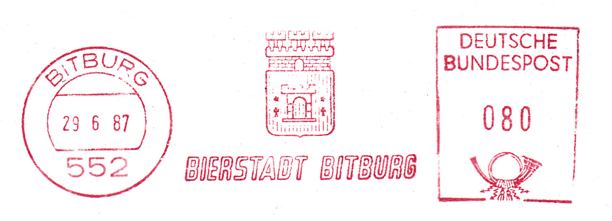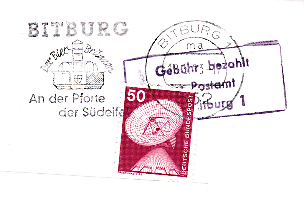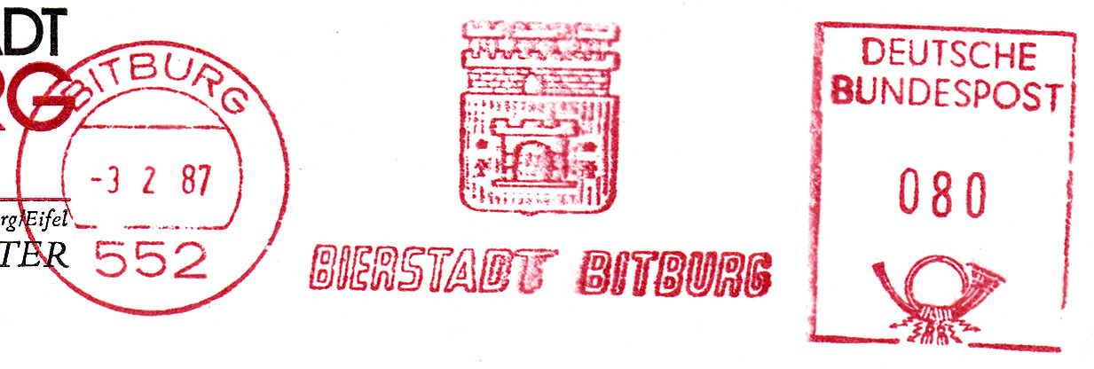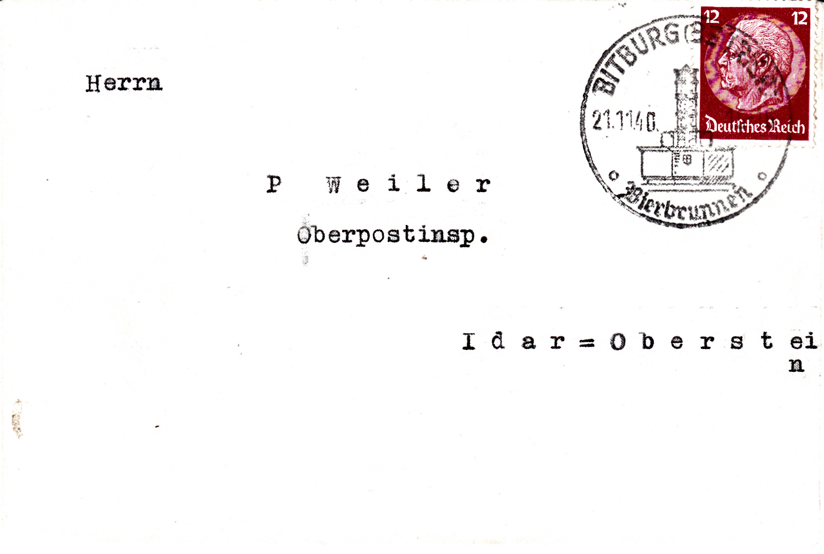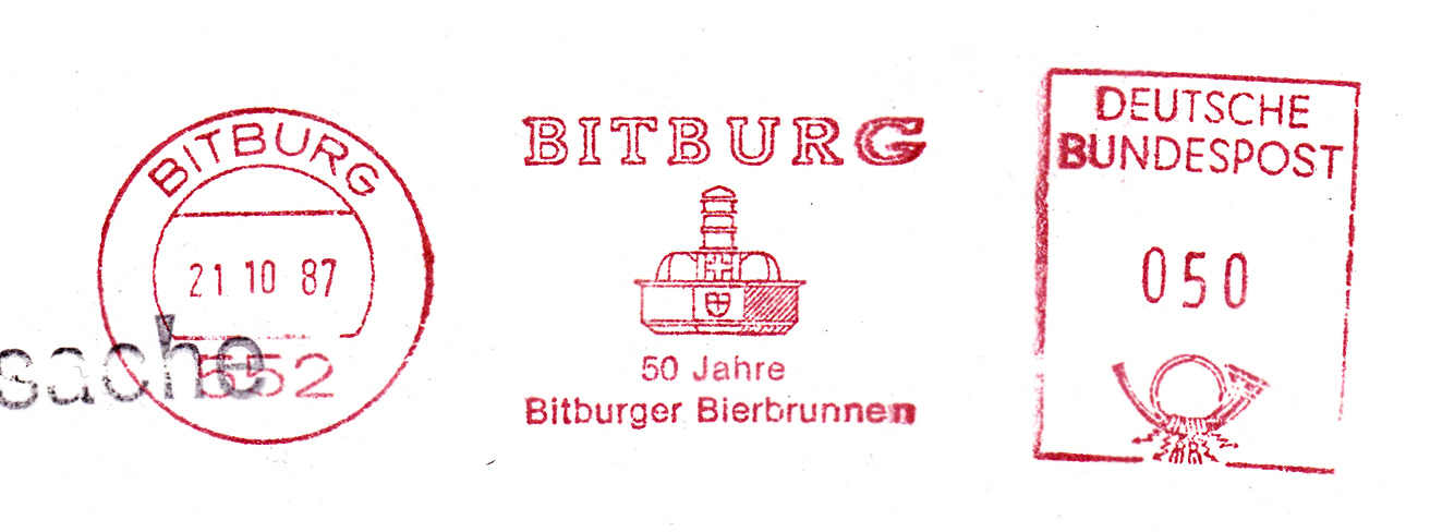 Dieser Handwerbestempel des Postamtes Bitburg (BZ Trier) vom 21.11.1940 zeigt den Bierbrunnen im Stempelbild.