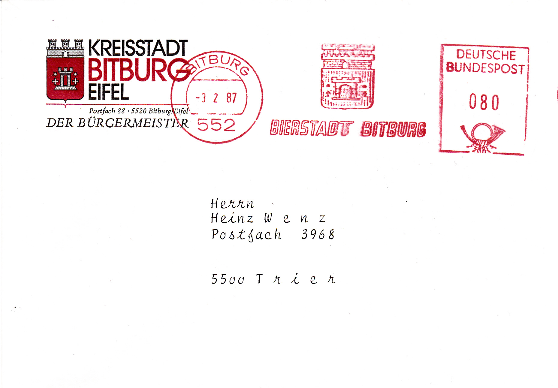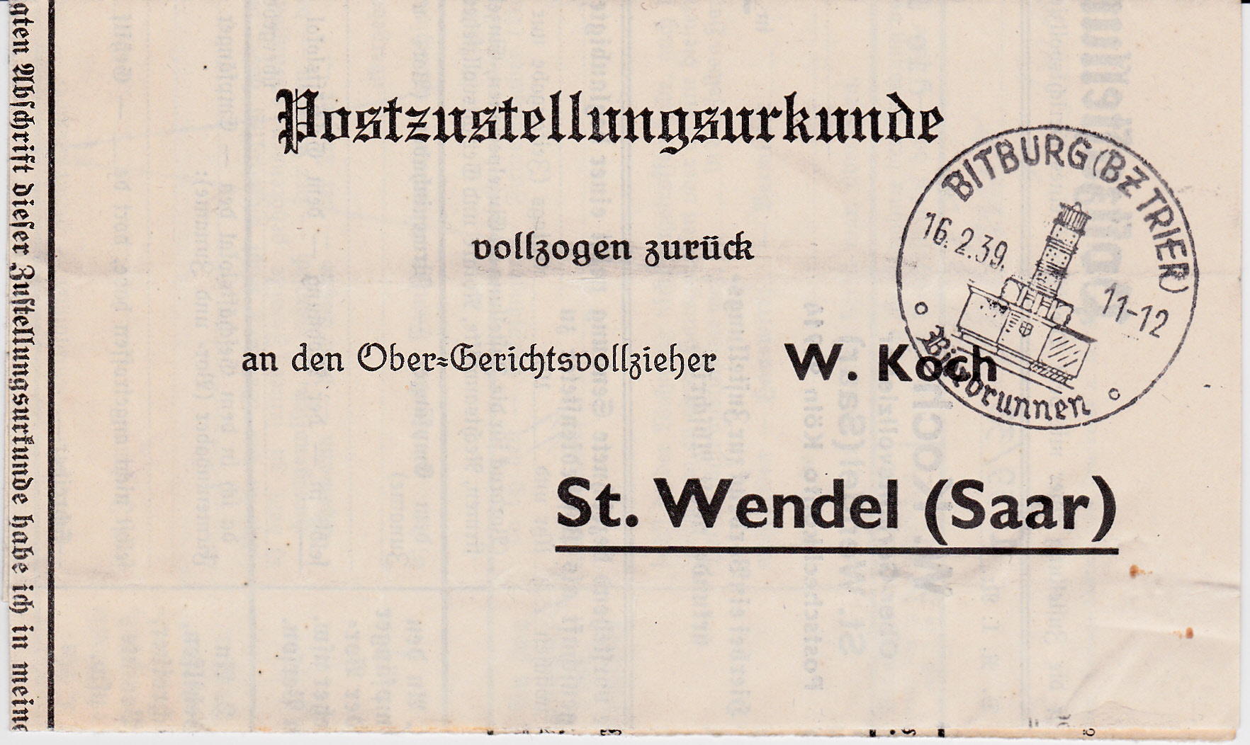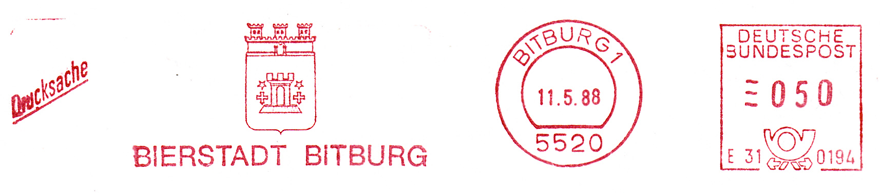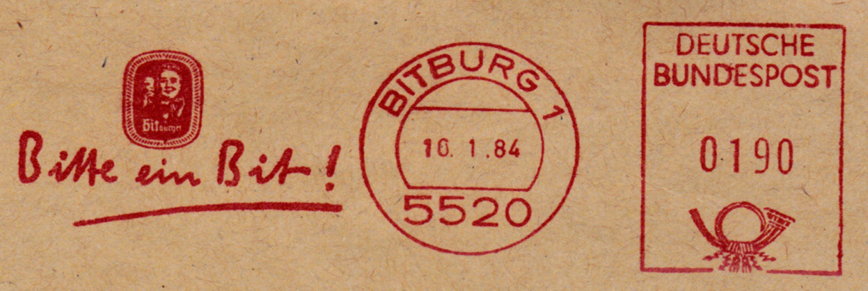 Dieser Handwerbestempel des Postamtes Bitburg (BZ Trier) vom 21.11.1940 zeigt den Bierbrunnen im Stempelbild.