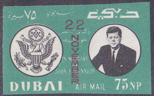 Zum 1. Todestag von John F. Kennedy ist in Dubai eine nicht ausgegebene Marke in der Zeichnung der Marke zum Tod von John R. Kennedy mit einem rotem Buchdruck-Aufdruck "22 NOVEMBER" erschienen. Hier zeige ich die geschnittene Variante (MiNr 144 B).