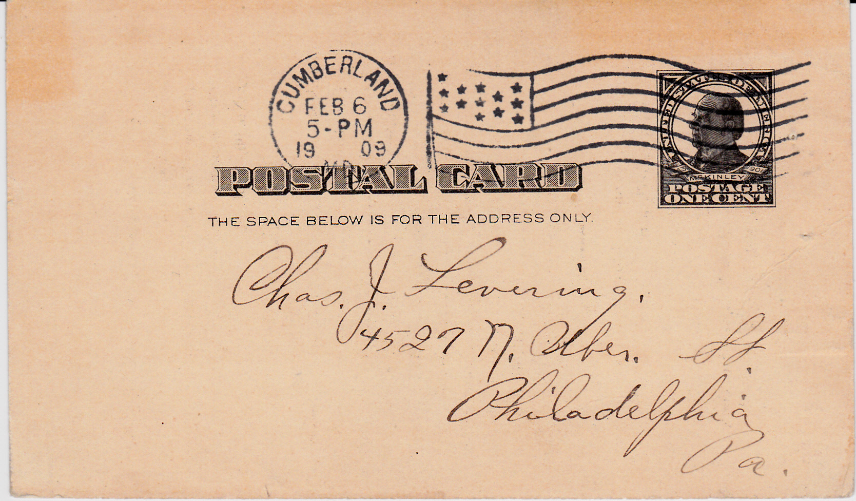 Ganzsachenpostkarte mit einem Wertstempel zu 1 Cent mit einem Porträt vom William McKinley, die 1909 von Cumberland nach Philadelphia verschickt worden ist.