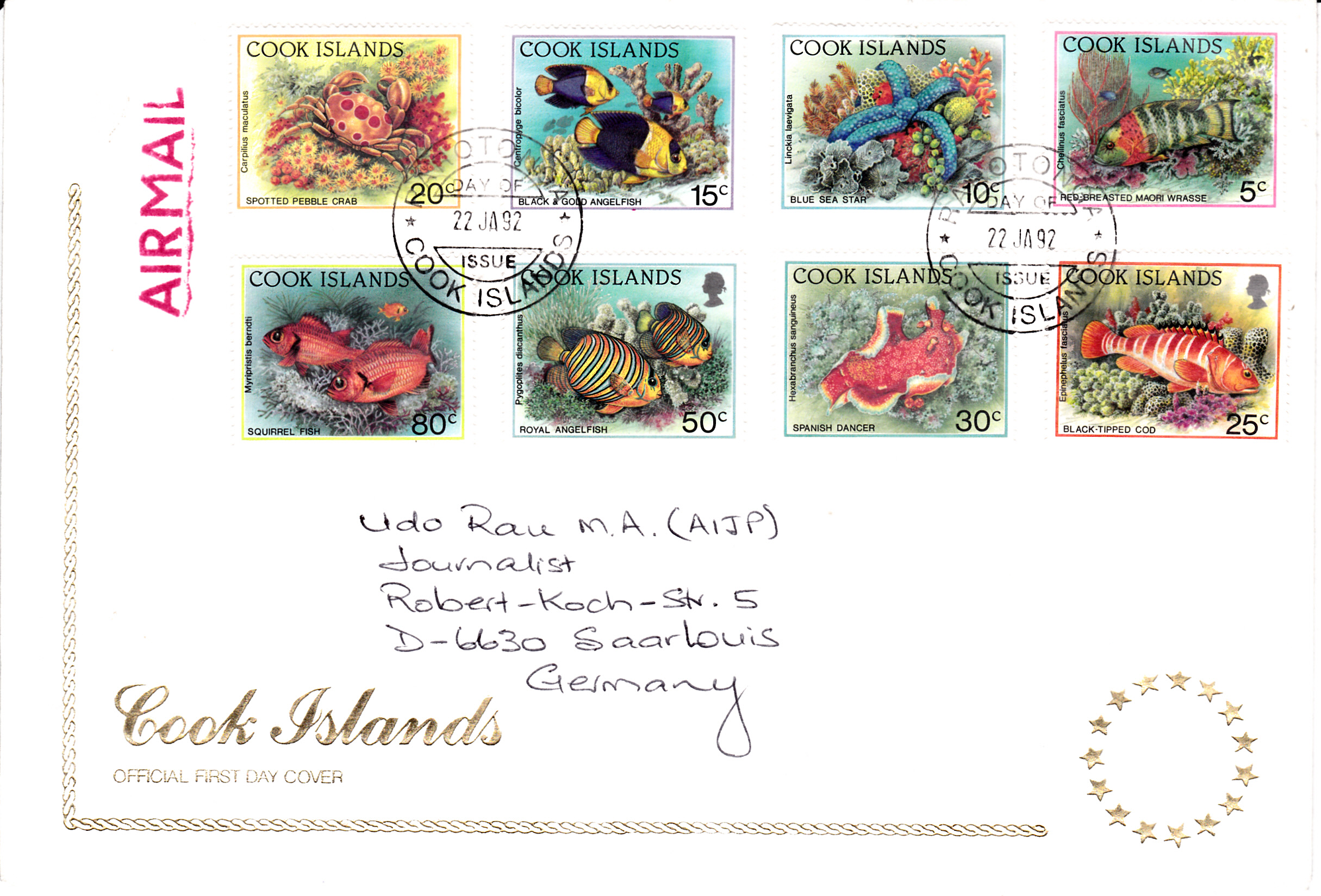Auf diesem Brief wurden alle Marken dieser Dauerserie "Leben am Korallenriff" mit dem Ausgabedatum 22.01.1992 mit dem Ersttagstempel entwertet.