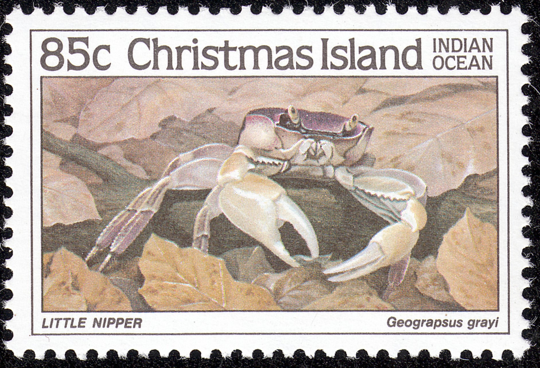 Den Anfang macht diese Briefmarke von der Weihnachtsinsel = Christmas Island, die einen "Little Nipper" = lateinisch: Geograpsus grayi zeigt: