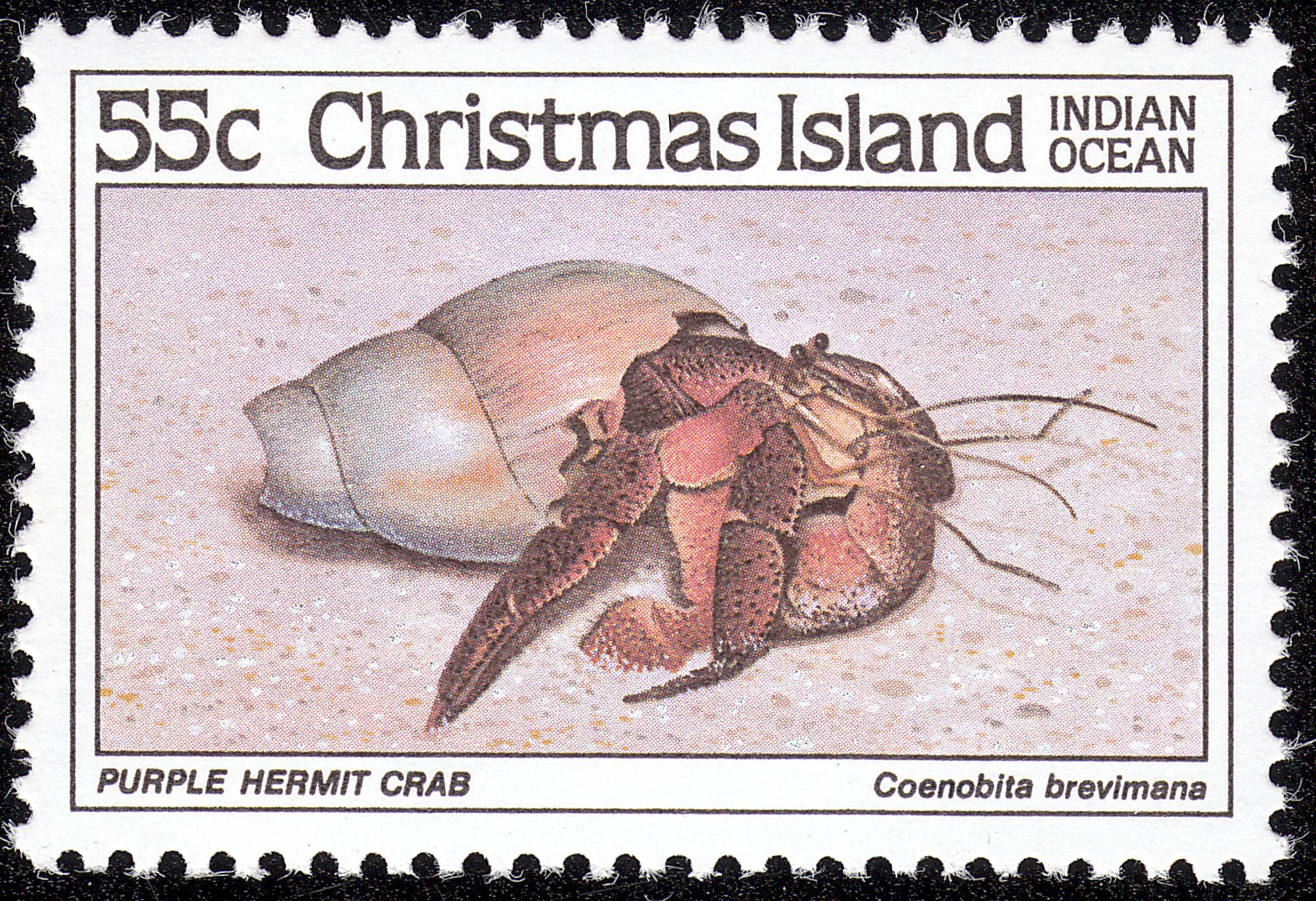 Dieses Postwertzeichen von der Weihnachtsinsel = Christmas Island zeigt einen Vertreter der Art Coenobita brevimanus = Lila Landeinsiedlerkrebs: