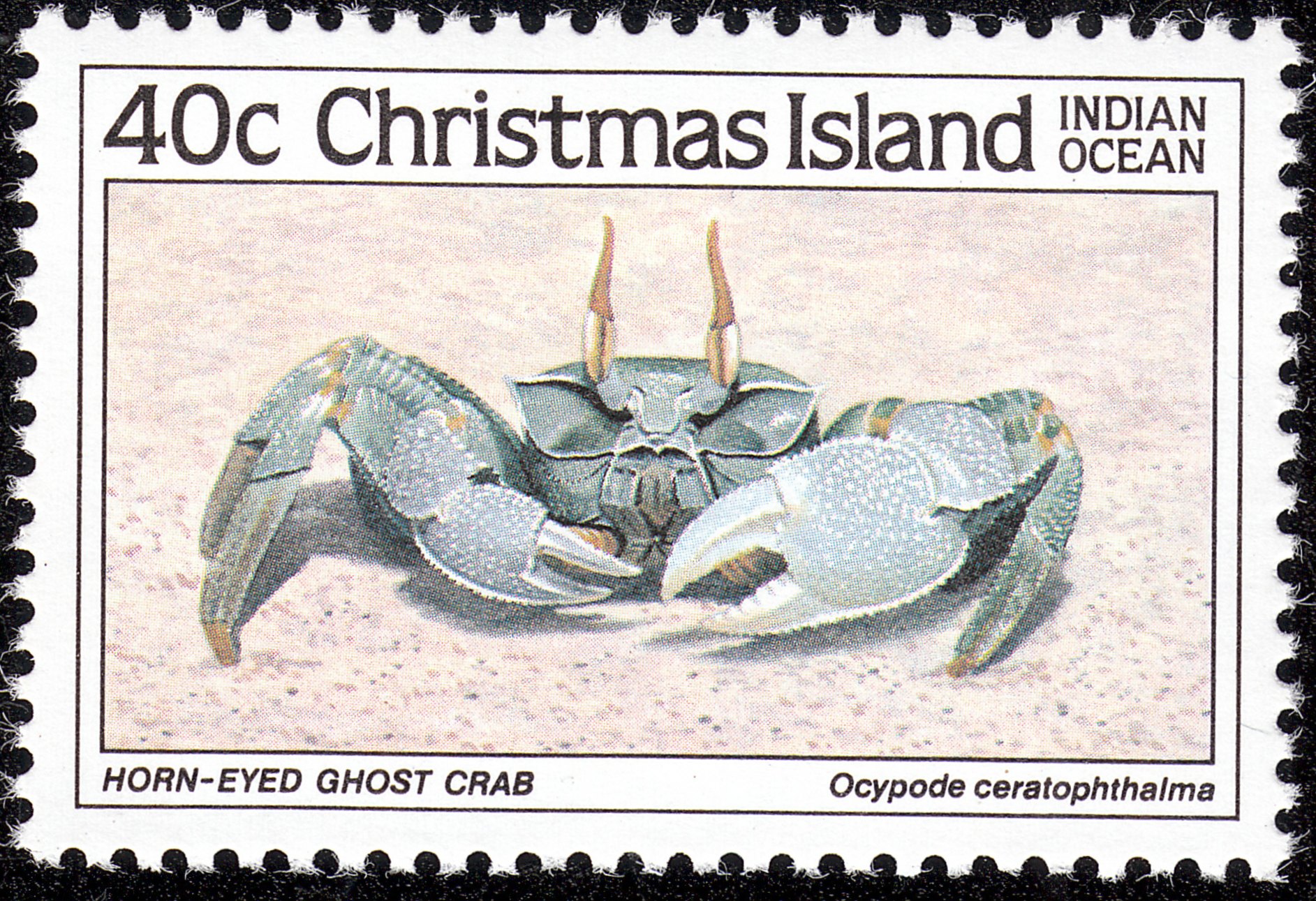 Dieses Postwertzeichen von der Weihnachtsinsel = Christmas Island zeigt ein Exemplar der "Gehörnten Geisterkrabbe":